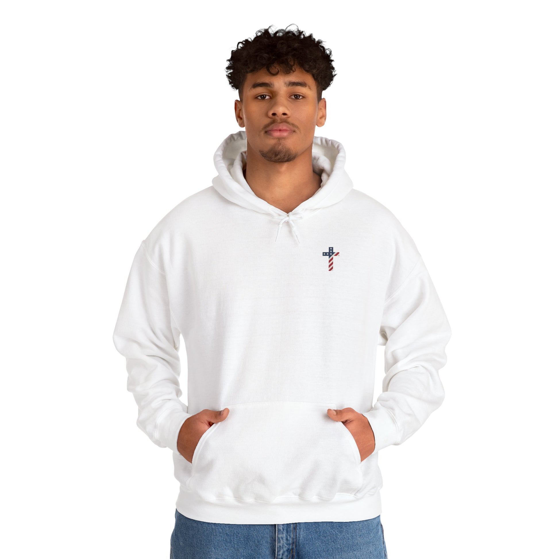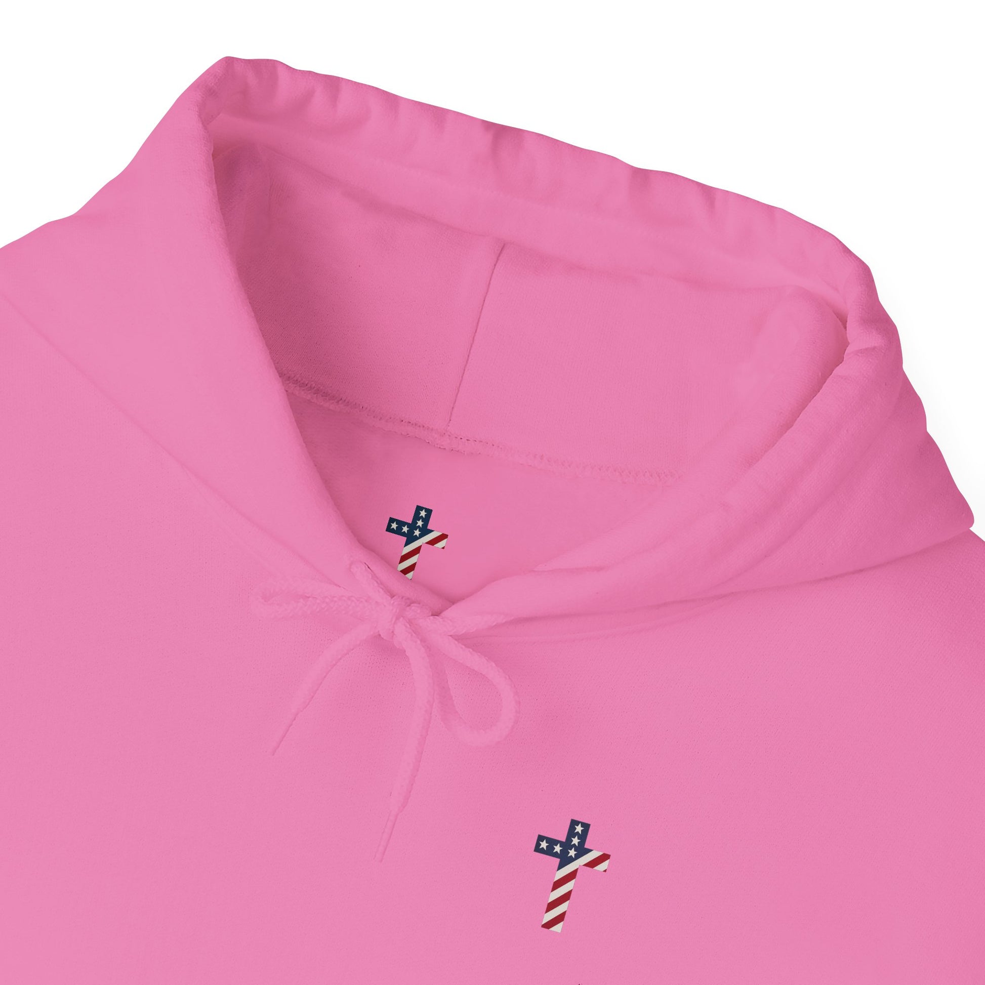 Embrace faith and freedom with our American Flag Cross hooded sweatshirt. Featuring a bold yet simple cross design infused with the stars and stripes, this hoodie is a meaningful way to show both your love for Christ and your country. Made from the same soft, durable Gildan fabric you trust, it offers lasting comfort for everyday wear or casual gatherings. Stay cozy, stand proud, and let your faith and patriotism shine in style.