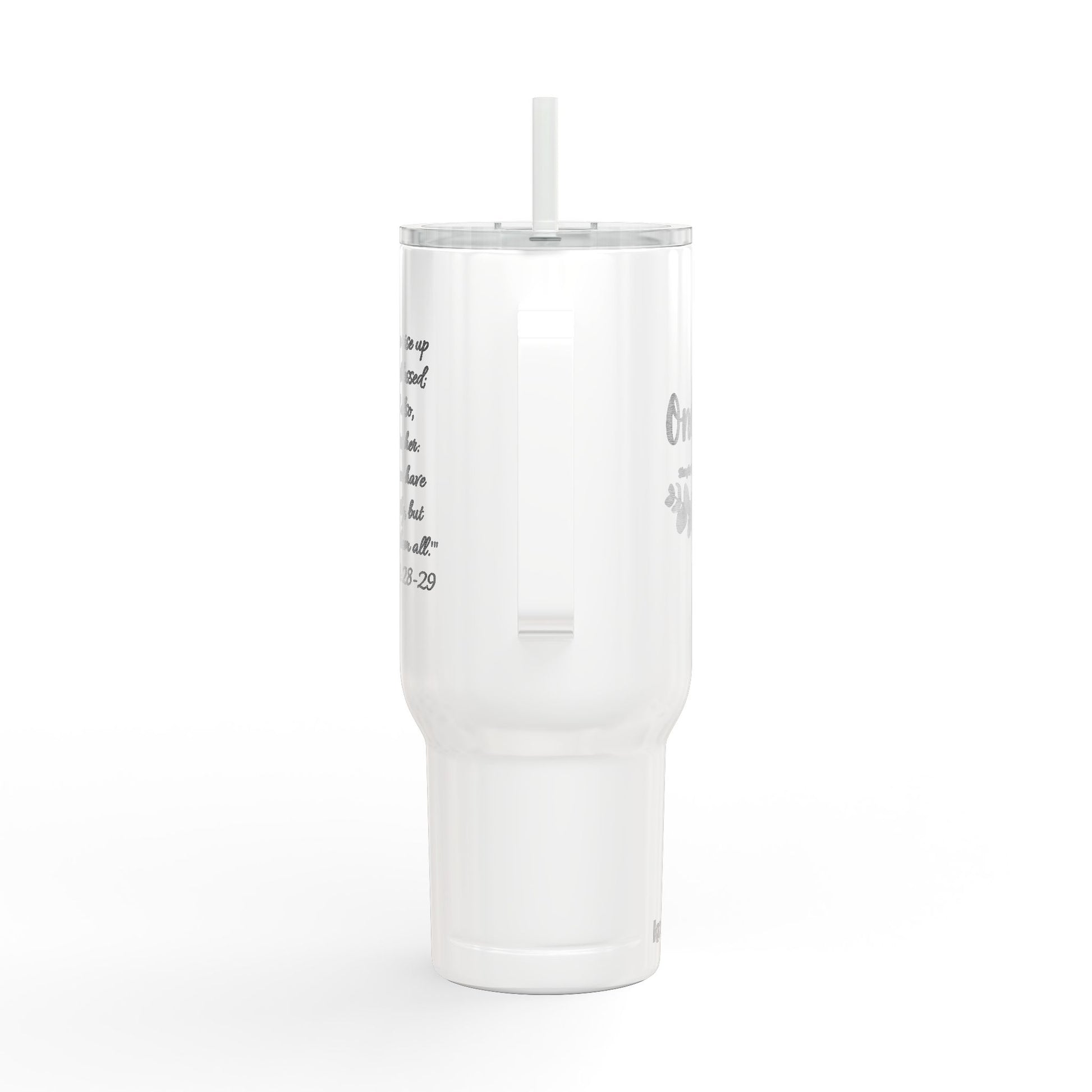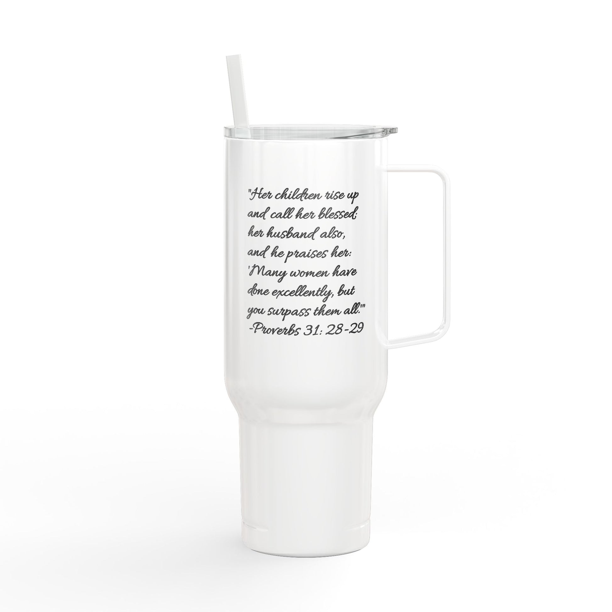 Stay inspired and hydrated with this 40 oz insulated tumbler, featuring the uplifting scripture from Proverbs 31:28-29: “Her children rise up and call her blessed; her husband also, and he praises her: ‘Many women have done excellently, but you surpass them all.’”