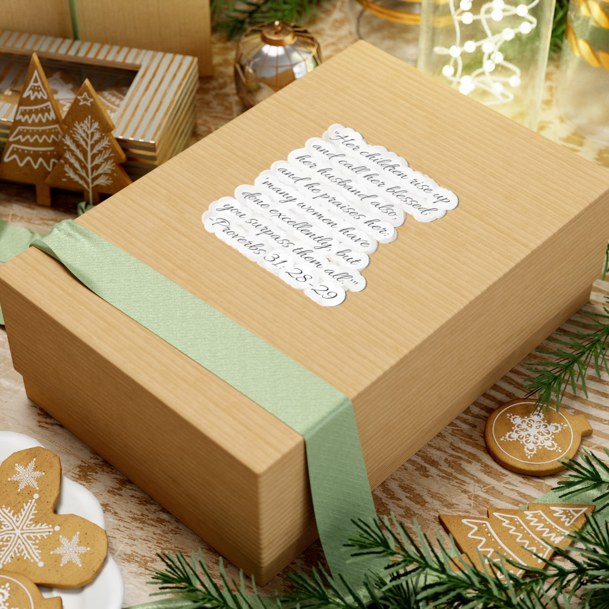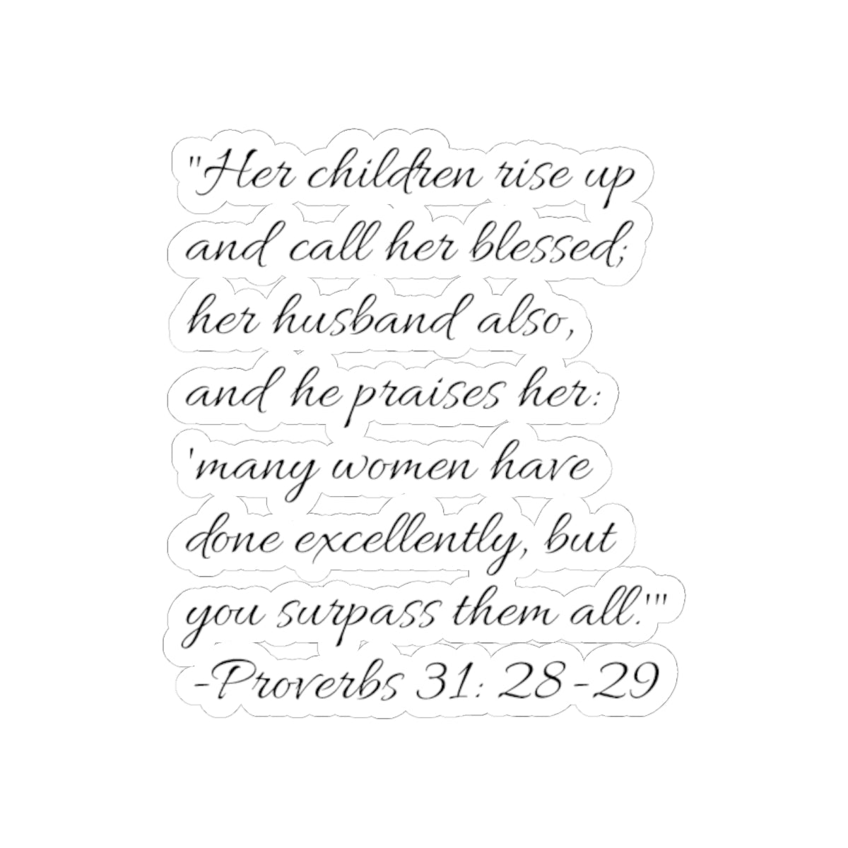Elevate your message with our premium kiss-cut stickers featuring the incrdible Proverbs 31: 28-29 verse that highlights the important women in our lives. Perfect for spreading inspiration and sharing faith, these durable stickers come in versatile sizes: 2x2, 3x3, 4x4, and 6x6. Made to last, their high-quality finish ensures vibrant colors and crisp details that stand out on laptops, water bottles, notebooks, and more. The kiss-cut design provides easy peel-and-stick application, allowing you to add a touch of positivity wherever you go. Share your values and make a statement with every sticker!